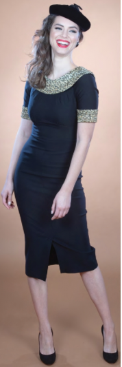 Fitted Dress with High Neckline, Faux Fur Peter Pan Collar, and 3/4 Sleeves.