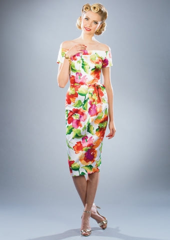 Fitted Dress with Off the Shoulder Sleeves and Off Center Bow at the Hip.