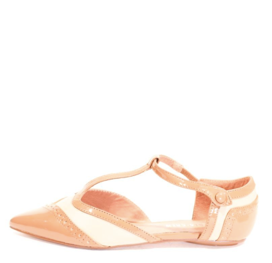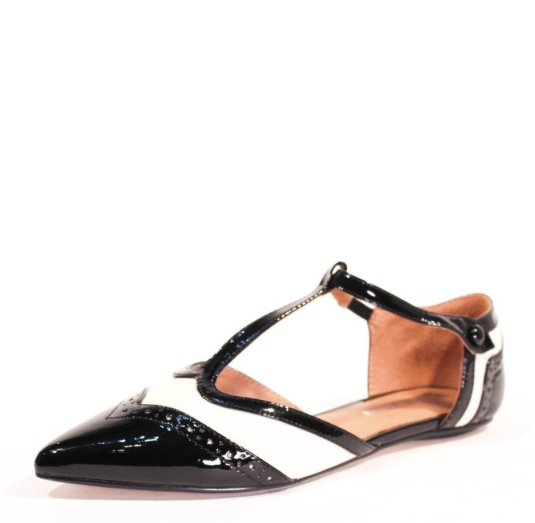 Two tone flat with pointed toe and T-strap.