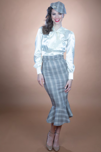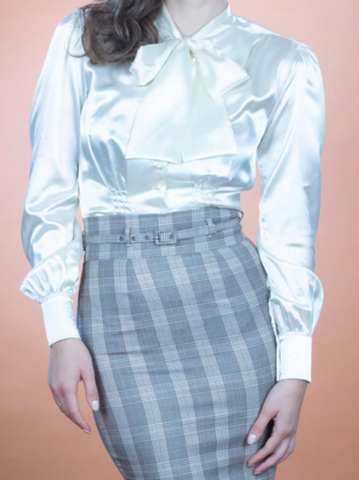 Fitted Dress 2 Piece Cream Satin Blouse. Pussycat bow with tapered sleeves with twisted sweetheart neckline, pencil skirt, and spaghetti straps.