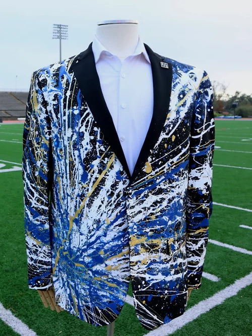 Each of these sport jackets is hand painted by a local New Orleans artist, making each of them a unique piece of wearable art. Perfect for making a statement at any event. Painted with a mix of acrylic and latex, these jackets are dry clean only.