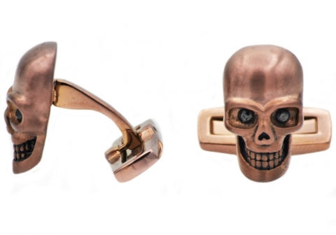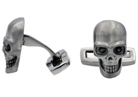 Gun metal plated stainless steel skull cufflinks with black cubic zirconia.