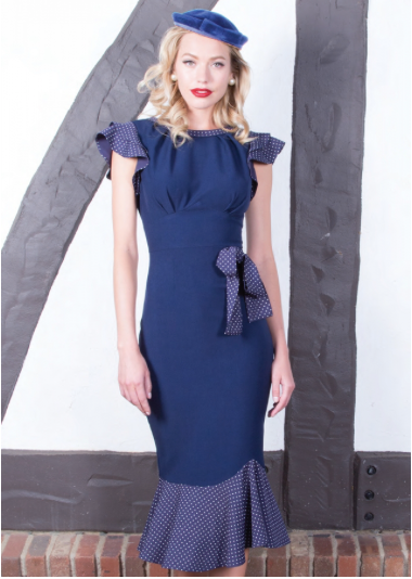 Fitted Dress with Billowing Sleeves, HighNeckline, and Trumpet Skirt.