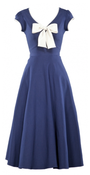 Belinda is a flirty swing dress with a V-neckline and an empire waist. A self-tie bow at the neckline matches the cream piping of the neckline and sleeves and contrasts beautifully with the rich navy of the dress for a look as sweet and american as cherry pie. Pair with your favorite red Mary Janes for a more 50’s rockabilly look.