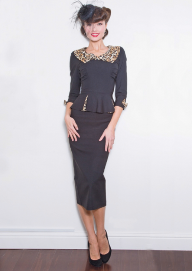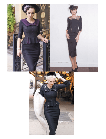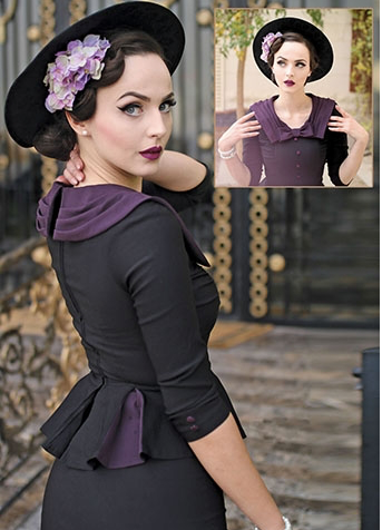 Fitted Dress with High Scoop Neck, Square Contrast Color Collar with Bow at the Neck, Peplum, Belt at the Waist, and 3/4 Sleeves.