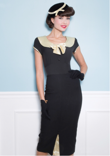 Fitted Dress with High Neckline, Gold Satin bow with contrast black buttons in center, and cap sleeves.