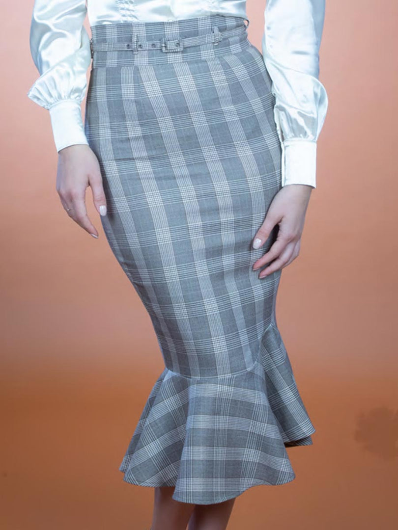 Add a retro flair to any top with our high-waisted, below-the-knee fitted skirt! Features a matching belt and fishtail detail at the hem.