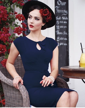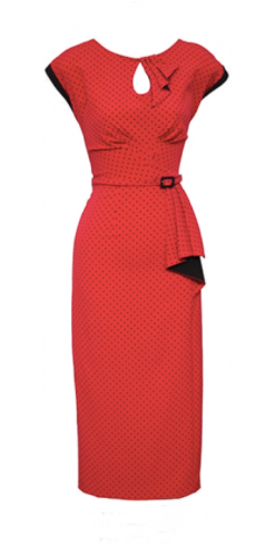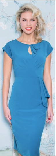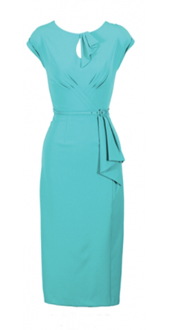Fitted Dress with High Neckline, Keyhole Cut-Out in Front, and Tiered Flap on Left Side, Plus Belt at the Waist.