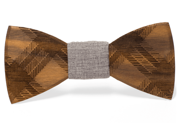 Walnut wood tie with etched plaid pattern and grey cloth center.