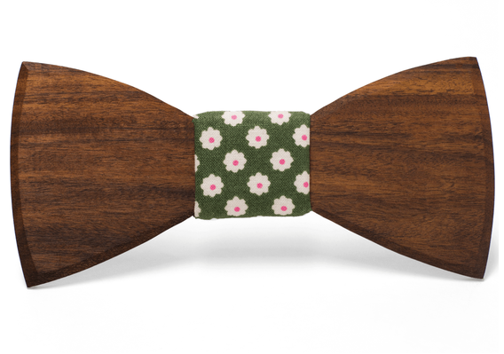 Striped rose wood tie with green and white floral cloth center.