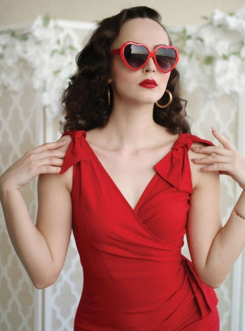 Fitted Dress with Cherry pattern fabric and Twisted Sweetheart Neckline, Rouching Across the Torso, and Cap Sleeves.